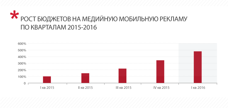 В первом квартале 2016 года произошло существенное повышение активности в мобильной рекламе — многие бренды, которые в прошлом году тестировали мобильные размещения, увеличили бюджеты. Появилось и много новых рекламодателей. По сравнению с первым кварталом 2015 года, количество рекламодателей увеличилось в 1,5 раза, а объем рекламы вырос в 5 раз. Также расширился и набор мобильных инструментов, которые используются брендами для продвижения: добавилось мобильное видео и in-page форматы.