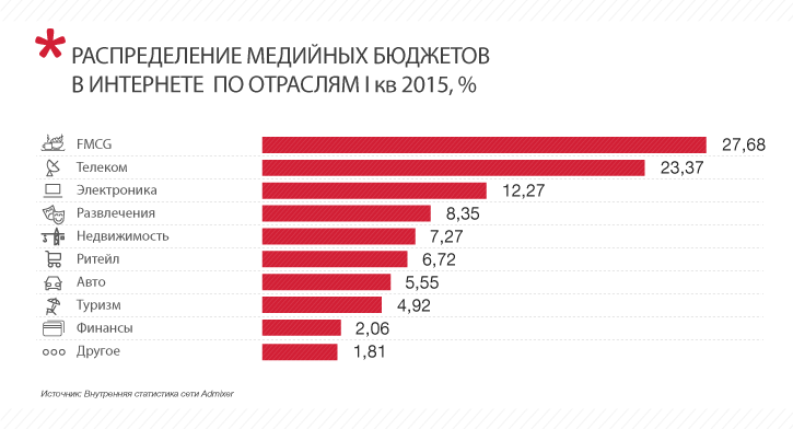 Среди категорий рекламодателей, которые размещаются в мобайле, наибольшую активность в первом квартале проявили компании FMCG-сегмента (продукты, напитки, средства гигиены и бытовая химия), значительно увеличив объемы рекламы и выйдя на первое место по затратам на мобильную рекламу. По итогам трех месяцев доля FMCG-бюджетов составила 27,68%. Второе место закономерно заняли мобильные операторы — 23,37%, на третье место поднялась электроника и бытовая техника — 12,27%, где большинство брендов уже адаптировали стратегии под мобайл.