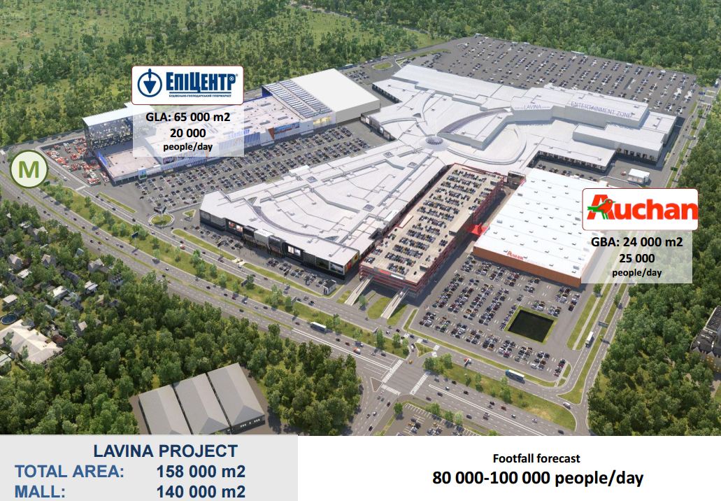Общая площадь торгового центра — 140 000 кв. м, арендуемая — 115 000 кв. м. Начальник отдела аренды эксклюзивного брокера LAVINA Mall компании UTG Сергей Заика, презентуя ТРЦ на Форуме новой торговой недвижимости New Comers, говорил, что в центре будут работать около 500 магазинов. «Это будут лучшие крупноформатные магазины Киева», — отмечал он в ходе выступления.