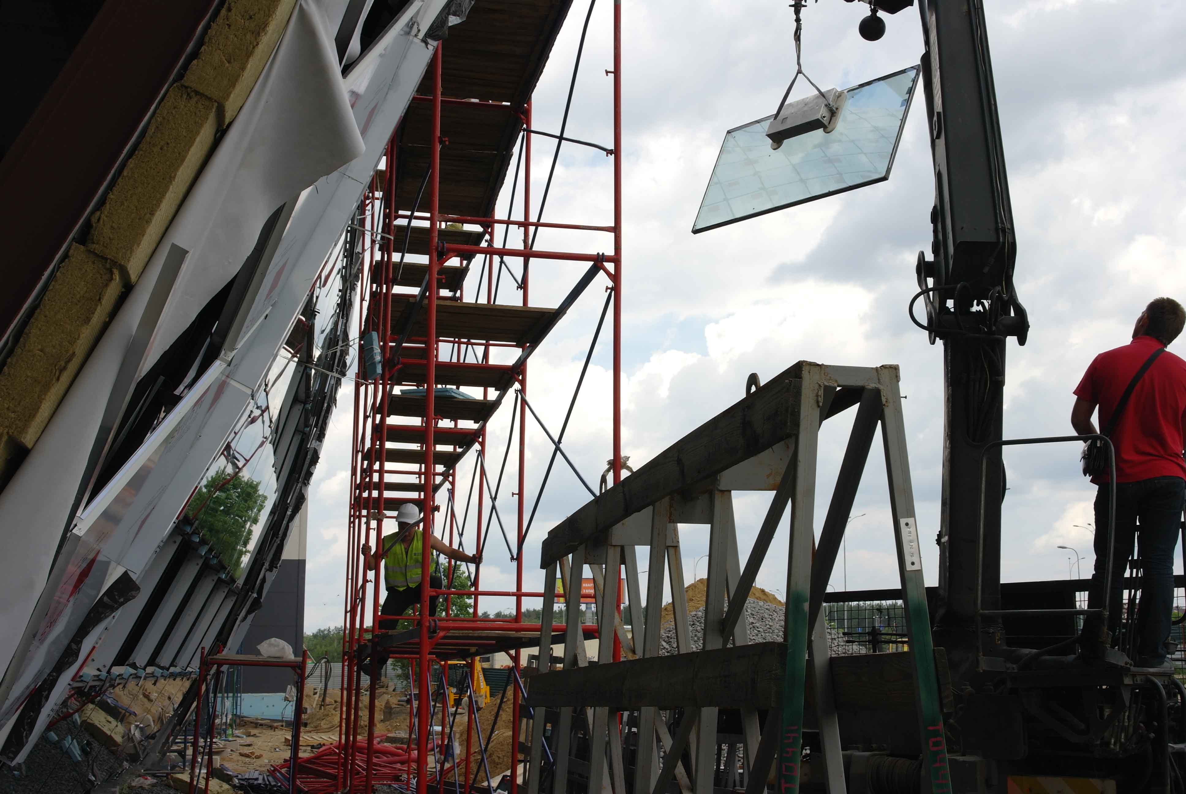 Идет остекление фасада главного входа, ведутся подготовительные работы по укладке плитки перед входом.