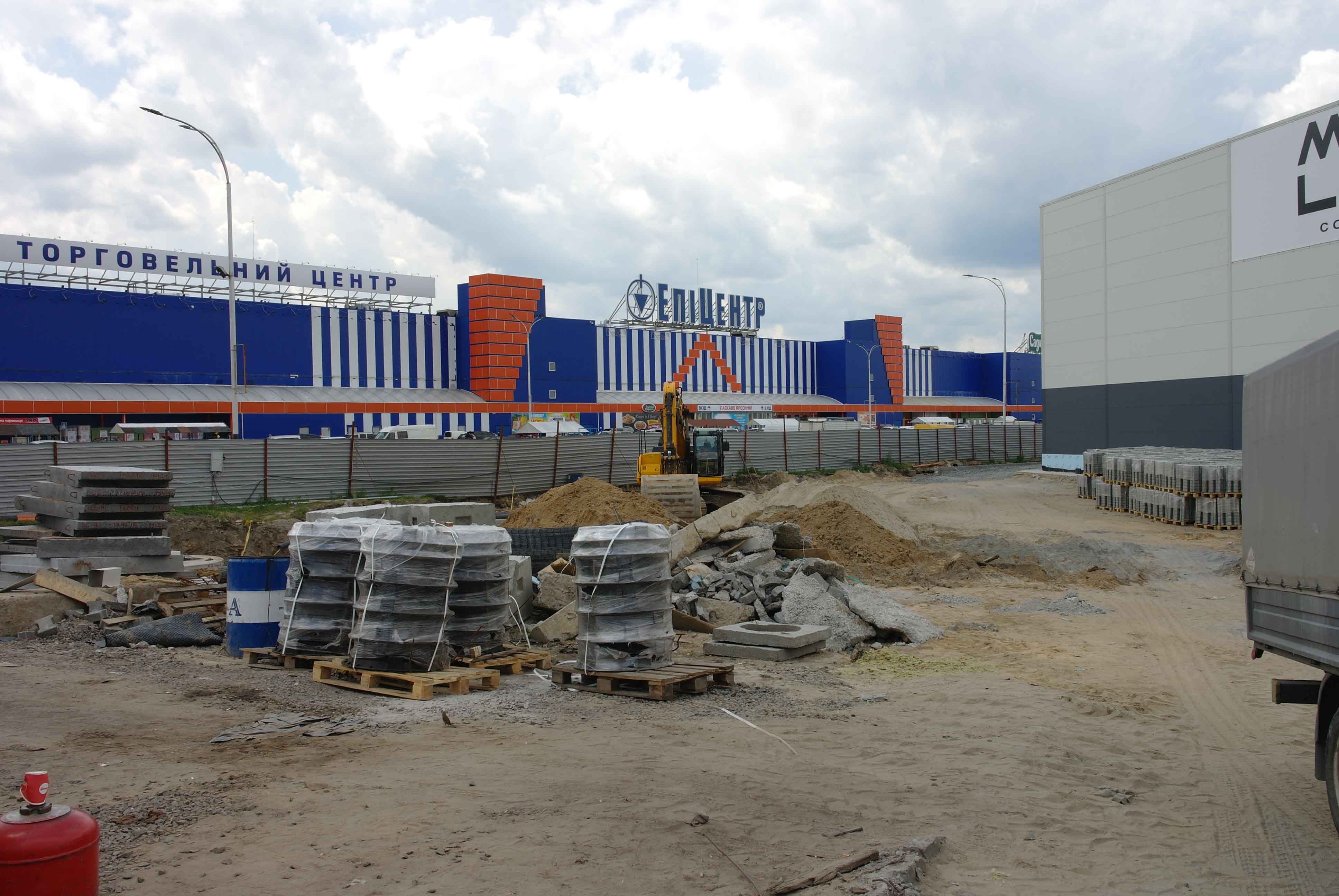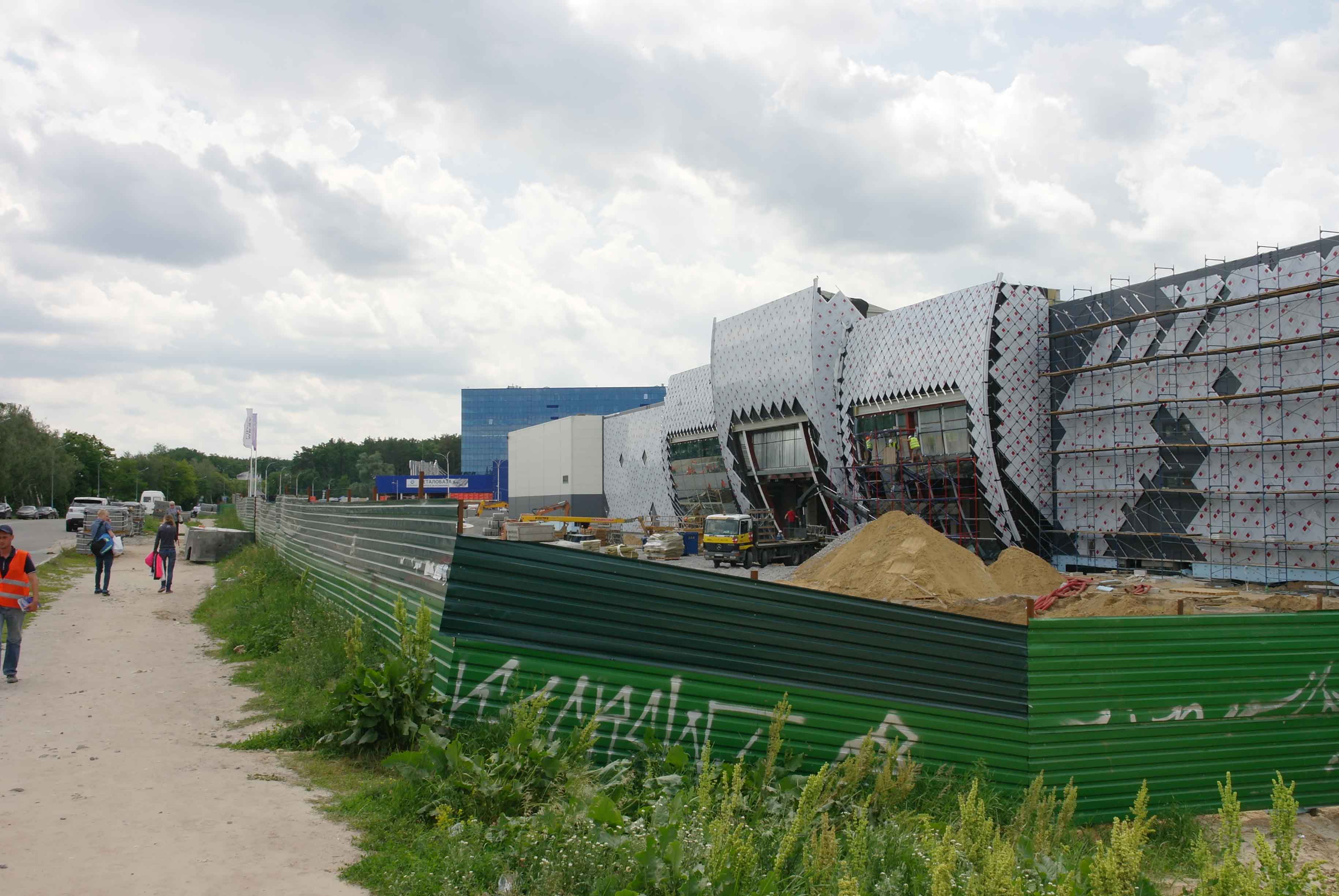 Так выглядит главный вход со стороны проспекта Академика Палладина. С правой стороны находится «Ашан», с левой стороны от строящегося ТРЦ — «Эпицентр».