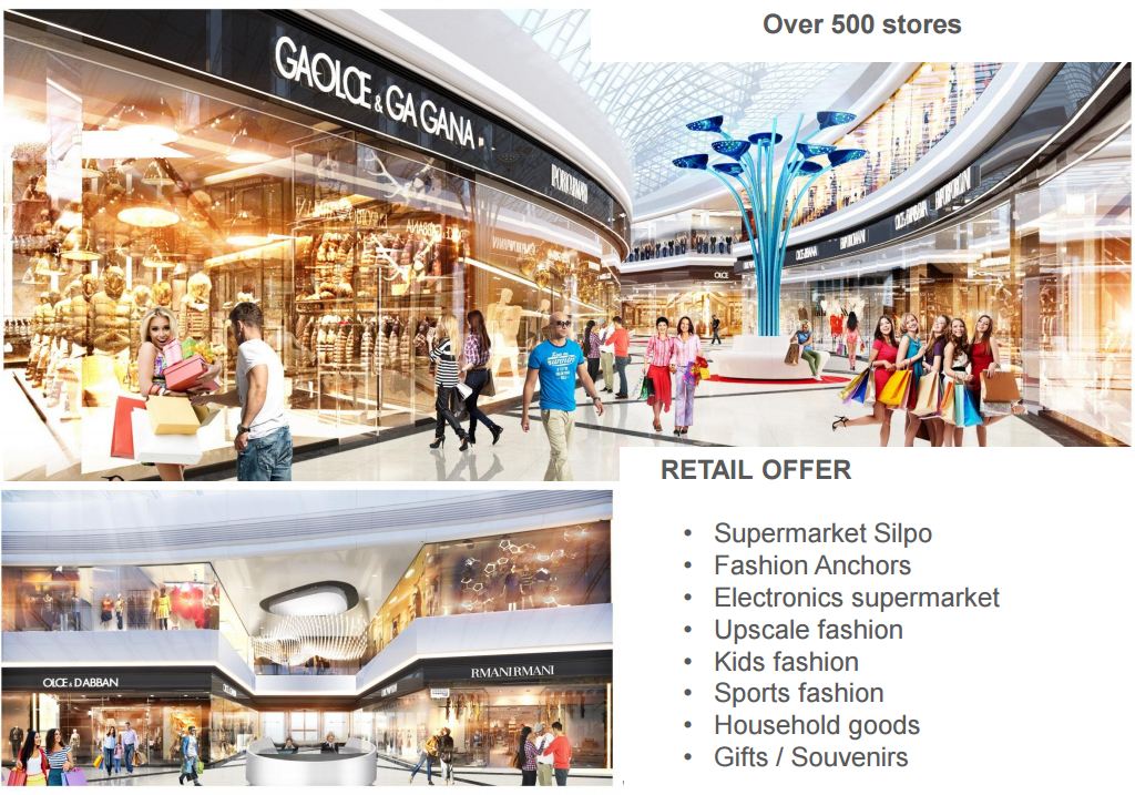 До открытия осталось 2,5 месяца, однако до сих пор компания UTG не объявила о том, кто войдет в пул арендаторов и займет оставшиеся 83 000 кв. м торговой площади. Согласно презентации проекта, в ТРЦ будут работать fashion-операторы, супермаркет электроники, магазины детских и спортивных товаров, товаров для дома, сувенирные магазины. К открытию заявлены около 50 ресторанов и кафе.