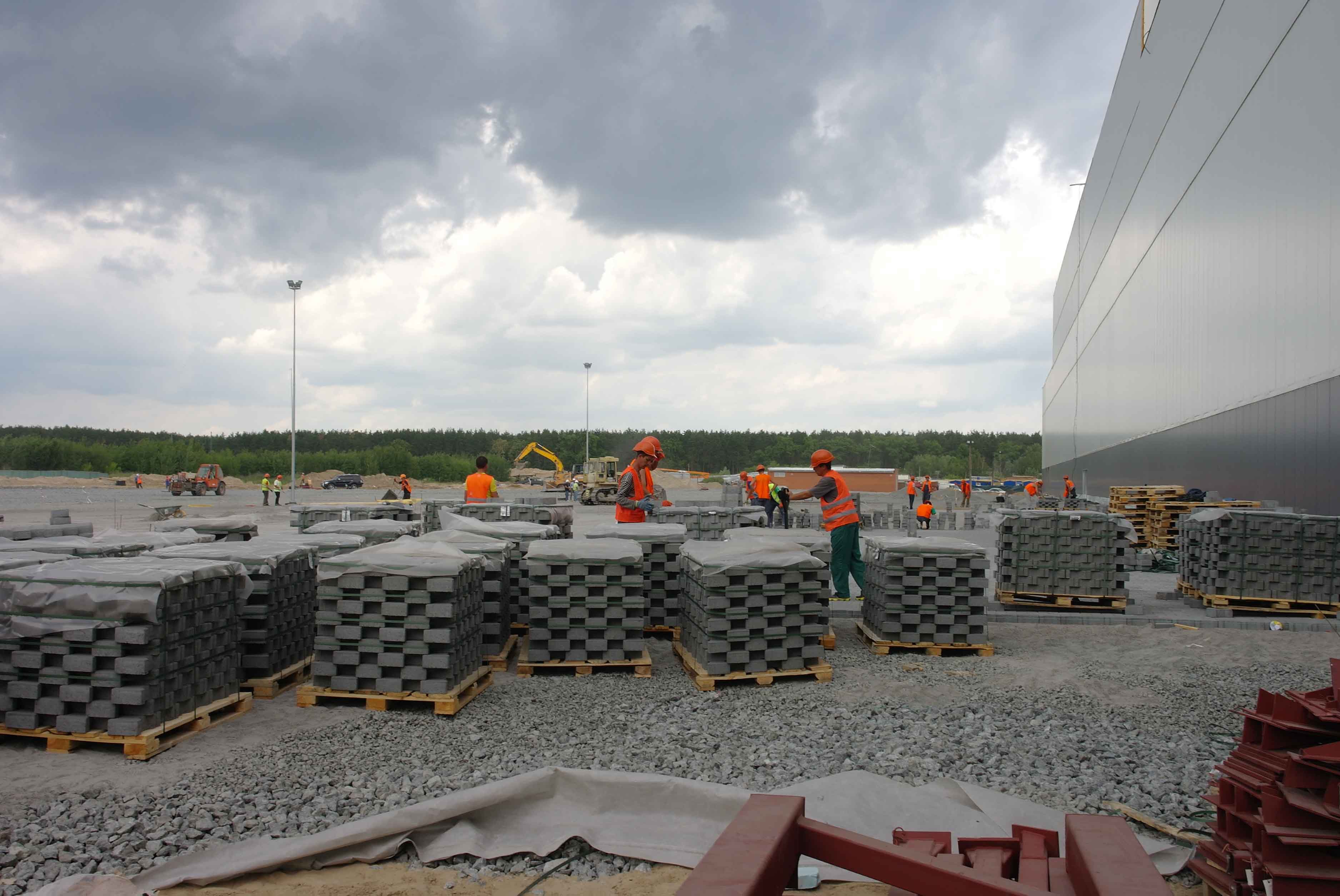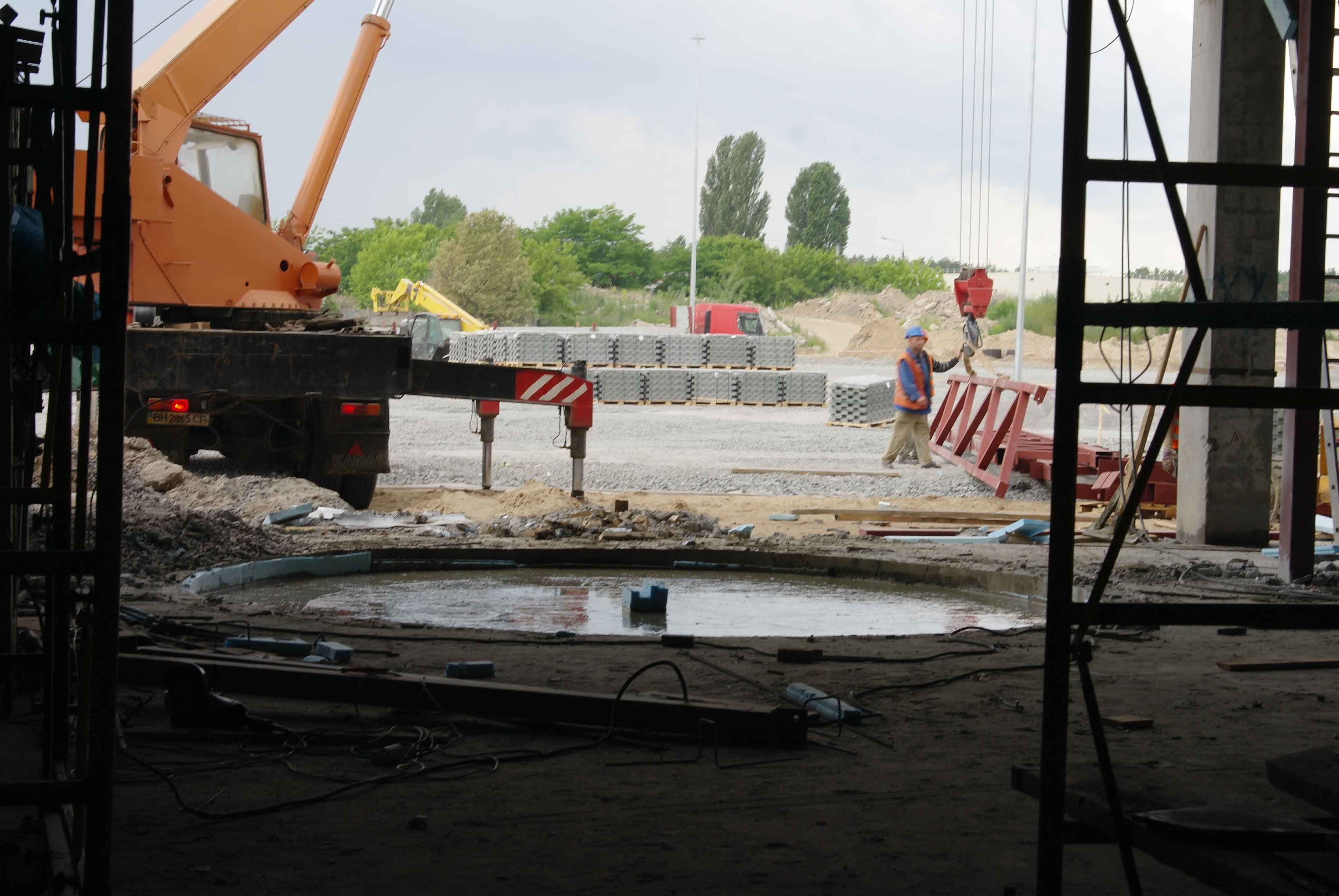 Пройдя через бутиковую галерею, мы выходим на парковку. На выходе все еще заливают полы и устанавливают конструкции выхода. На самой парковке сложена плитка, ведутся работы.