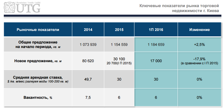 В компании UTG подвели итоги первого полугодия 2016 года состояния рынка коммерческой и жилой недвижимости города Киева. Рынок торговой недвижимости стабилизировался, вакантность перестала расти и остановилась на отметке 6%, на украинский рынок зашло 10 новых брендов, увеличилась посещаемость торговых центров, арендные ставки могут вырасти до конца года на 5%. С учетом открытия двух новых торговых объектов в компании отмечают рекордную цифру нового торгового предложения. Также специалисты UTG рассказали о том, какие арендаторы откроют магазины 1 сентября, на техническое открытие в Lavina mall