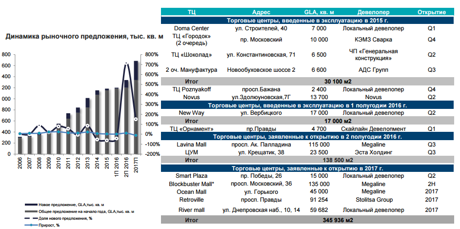 В 2017 году планируется открытие пяти новых объектов, среди которых Blockbuster Mall, Ocean Mall, Smart Plaza, общей площадью 350 000 кв. м. Рынок структурирован и движется в сторону качественных изменений как со стороны девелоперов, так и арендаторов, которые готовы предложить новые форматы.