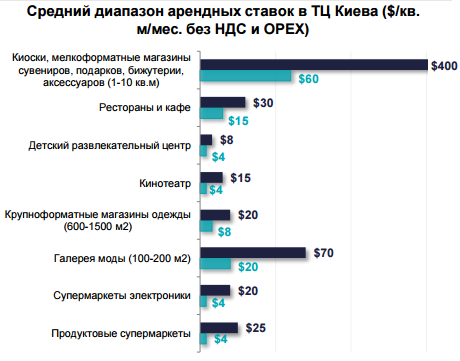 Арендные ставки стабилизировались и имеют тенденцию к росту. Средняя арендная ставка для магазинов моды площадью 100–200 кв. м составляет $30 без учета НДС и до конца года может вырасти на 5%. Ставки разные, привязаны к бизнесу арендаторов, так как они работают с разной маржинальной добавочной стоимостью. Продуктовые супермаркеты имеют ставки до $20 кв. м, магазины в галереях — до 70$/кв. м, мелкие форматы, такие как киоски, — несколько сот долларов.