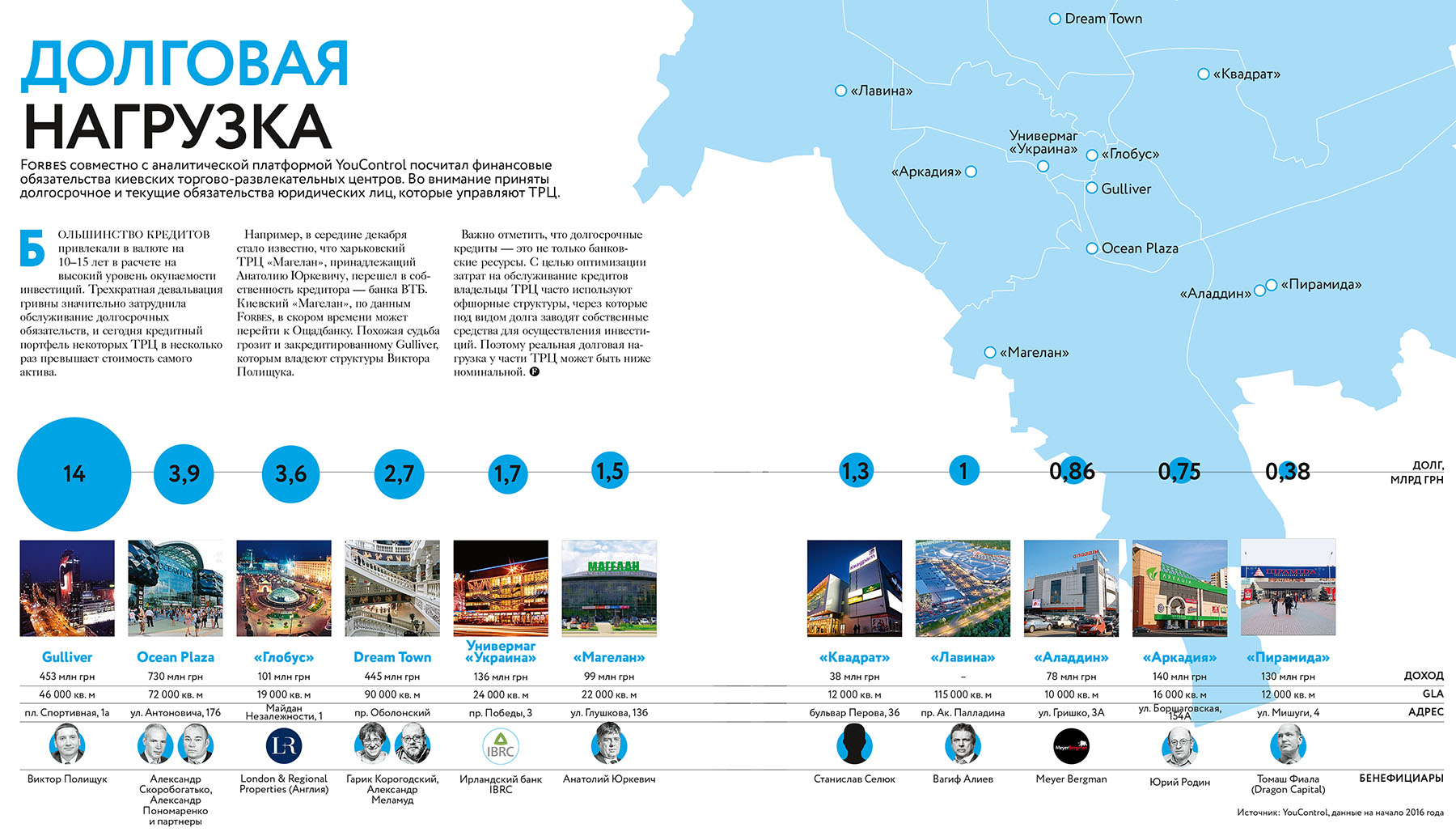 Например, в середине декабря стало известно, что харьковский ТРЦ «Магелан», принадлежащий Анатолию Юркевичу, перешел в собственность кредитора — банка ВТБ. Киевский «Магелан», по данным Forbes, в скором времени может перейти к «Ощадбанку». Похожая судьба грозит и закредитированному Gulliver, которым владеют структуры Виктора Полищука. Кредитная задолженность Gulliver составляет 14 млрд грн.