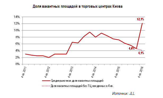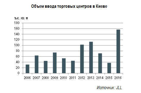В 4-м квартале 2016 года в Киеве были открыты два торговых объекта: department store «ЦУМ» (23 500 кв. м) и крупнейший в столице комплекс Lavina Mall (115 000 кв. м). По оценке JLL, совокупный ввод торговых площадей в 2016 году составил 156 700 кв. м, что является наивысшим показателем за всю историю рынка