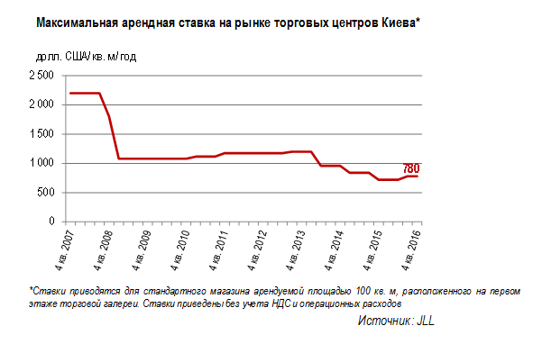 В 4-м квартале 2016 года максимальная ставка аренды на рынке качественных торговых центров Киева не изменилась и составила $780 за кв. м в год (без учета НДС и операционных расходов).