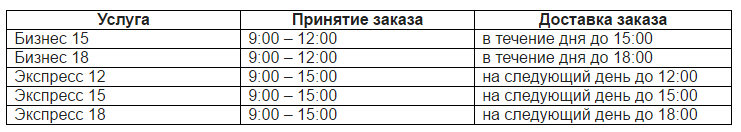 Клиенты могут заказать доставку документов и посылок день в день, или на следующий день с ограничением времени доставки до 12, до 15 и до 18 часов. Детальные условия предоставления услуги приведены в таблице ниже.