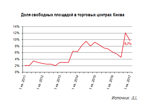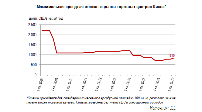 По данным компании JLL, максимальная арендная ставка в торговых центрах Киева в 1-м квартале 2017 года увеличилась на 4,5% и составила $815 за кв. м в год (без учета НДС и операционных расходов). При этом индивидуальные договоренности о фиксации курса доллара, которые наблюдались в 2014-2016 годах, практически полностью уступили место новым договорам аренды с указанием рыночной арендной ставки в иностранной валюте.