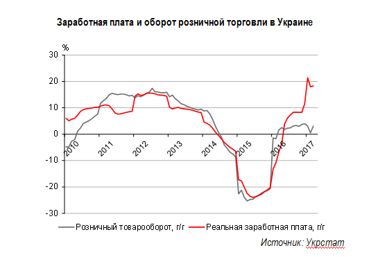По данным Укрстата, розничный товарооборот и заработная плата в реальном выражении в Украине за 1-й квартал 2017 года продемонстрировали рост на 3,1% и 18,3% в годовом сопоставлении соответственно.