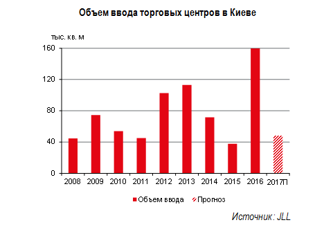 Новые торговые центры в январе-марте 2017 года в Киеве открыты не были. До конца года ожидается ввод трех торговых комплексов совокупной арендопригодной площадью 48 000 кв. м: ТЦ «Смарт Плаза» (15 000 кв. м), ТРЦ RiveGauche, фаза 1 (22 000 кв. м), «Ритейл Парк Петровка», фаза 1 (11 000 кв. м).