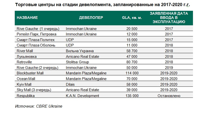 Несмотря на то, что темпы строительства остаются замедленными, значительный рост объема предложения торговых площадей ожидается в 2018-2019 годах. Если даты запланированных открытий не будут перенесены на 2020 год, более чем 530 000 кв.м новых площадей ожидается к выходу на рынок. Активные строительные работы ведутся в левобережной части Киева в ТРЦ Rive Gauche (GLA - 70 000 кв. м в двух очередях) и в ТРЦ River Mall (GLA - 58 700 кв.м).