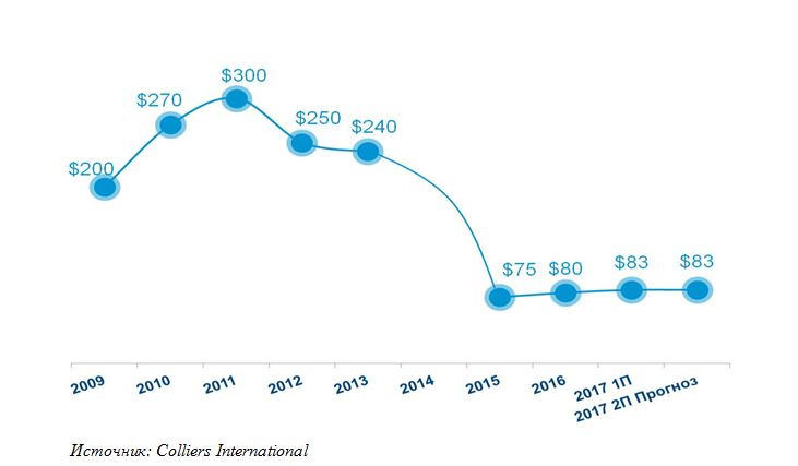 В результате арендная ставка постепенно начала восстанавливаться, достигнув пика в 2011 году — $300 за 1 кв. м, но до докризисного уровня так и не вернулась (см. график). Начавшиеся в конце 2013 года противостояния на Майдане Незалежности и последовавший за этими событиями кризис привели к массовому закрытию магазинов на Крещатике и снижению пешеходного потока. В результате доля вакантных помещений по итогам первой половины 2014 года достигла 12%, а уже в августе 2015 года — 19%. Касательно арендных ставок, то за отчетный период они снизились до уровня ставок в торговых центрах Киева (до $70 за кв. м в месяц), чего не было даже в кризисные 2008–2009 годы.