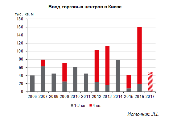 Впервые с 2006 года в Киеве за три квартала не было введено в эксплуатацию ни одного качественного торгового центра. На 4-й квартал заявлено открытие трех объектов: ТЦ «Смарт Плаза» (15 000 кв. м), ТРЦ Rive Gauche, фаза 1 (22 000 кв. м), «Ритейл Парк Петровка», фаза 1 (11 000 кв. м). Таким образом, совокупный объем ввода торговых площадей в Киеве составит 48 000 кв. м.