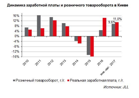 Снижение объема нового предложения происходит на фоне стабилизации макроэкономических показателей. «Начиная с 2016 года в Киеве, как и в стране в целом, наблюдается реальный рост заработной платы и розничного товарооборота. При этом, если в прошлом году потребитель не был готов пропорционально доходам увеличивать расходы, то в текущем году мы наблюдаем сопоставимые темпы роста данных показателей в Киеве. Это свидетельствует о восстановлении розничного рынка и стимулирует новое строительство», — отмечает Дарина Кулага, аналитик компании JLL (Украина).