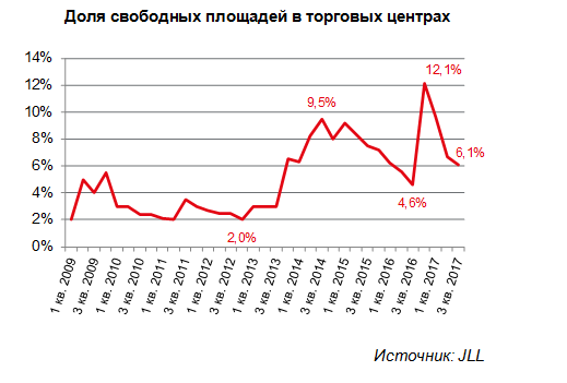 В результате роста спроса доля свободных площадей в торговых центрах Киева за 3-й квартал 2017 года снизилась на 0,6 п.п., до 6,1%.