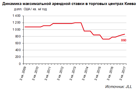 Аналитики JLL прогнозируют увеличение объема ввода торговых центров в Киеве в среднесрочной перспективе. Так, в 3-м квартале возобновилось строительство ТРК Ocean Mall, была анонсирована 2-я фаза ТРЦ «Апрель». При сохранении тенденции к восстановлению экономики в 2018 году ожидается оживление и на других ранее «замороженных» строительных площадках.