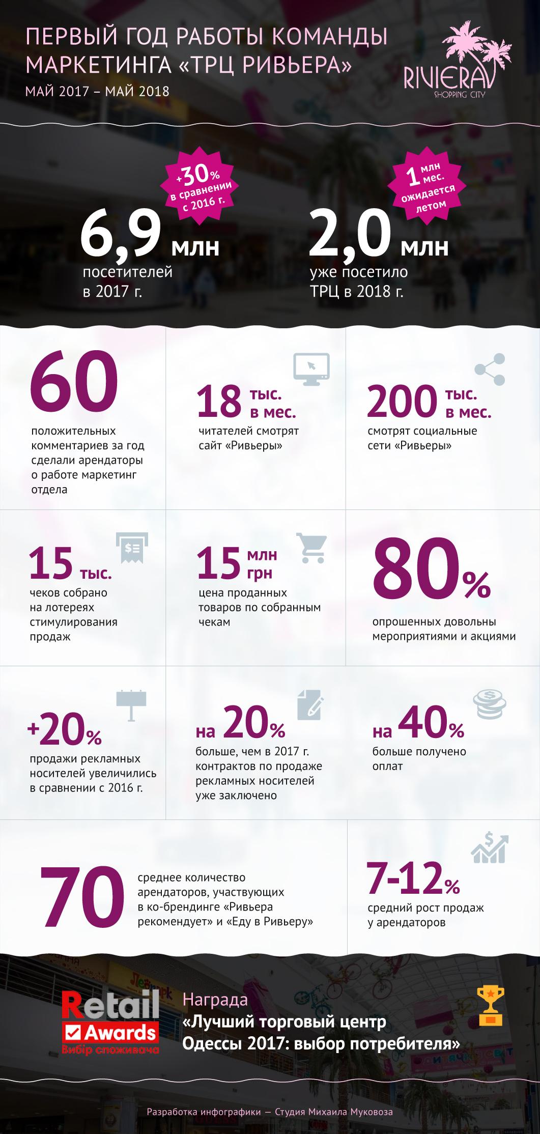"Не менее значимым фактором высоких показателей является слаженная работа всей управляющей команды с маркетинговым отделом, который состоит из 5 человек: Марина Чебаненко - маркетинг менеджер, Анна Липатова - дизайнер, Жанна и Алексей - администраторы информационной стойки и я. На аутсорсе: агентство BRO с Алисой Макаренко, Владимиром Худой, Еленой Кислой и Лилией Коломорой ведут нас по PR & SMM. Ивент-менеджер Раду Морару. Благодаря тесной коммуникации и высокой компетентности каждого члена команды удается быстро и качественно реализовывать новые идеи и проекты, что в свою очередь, отражается на общих показателях эффективности ТРЦ Ривьера", - отмечает Ян Шкуро.