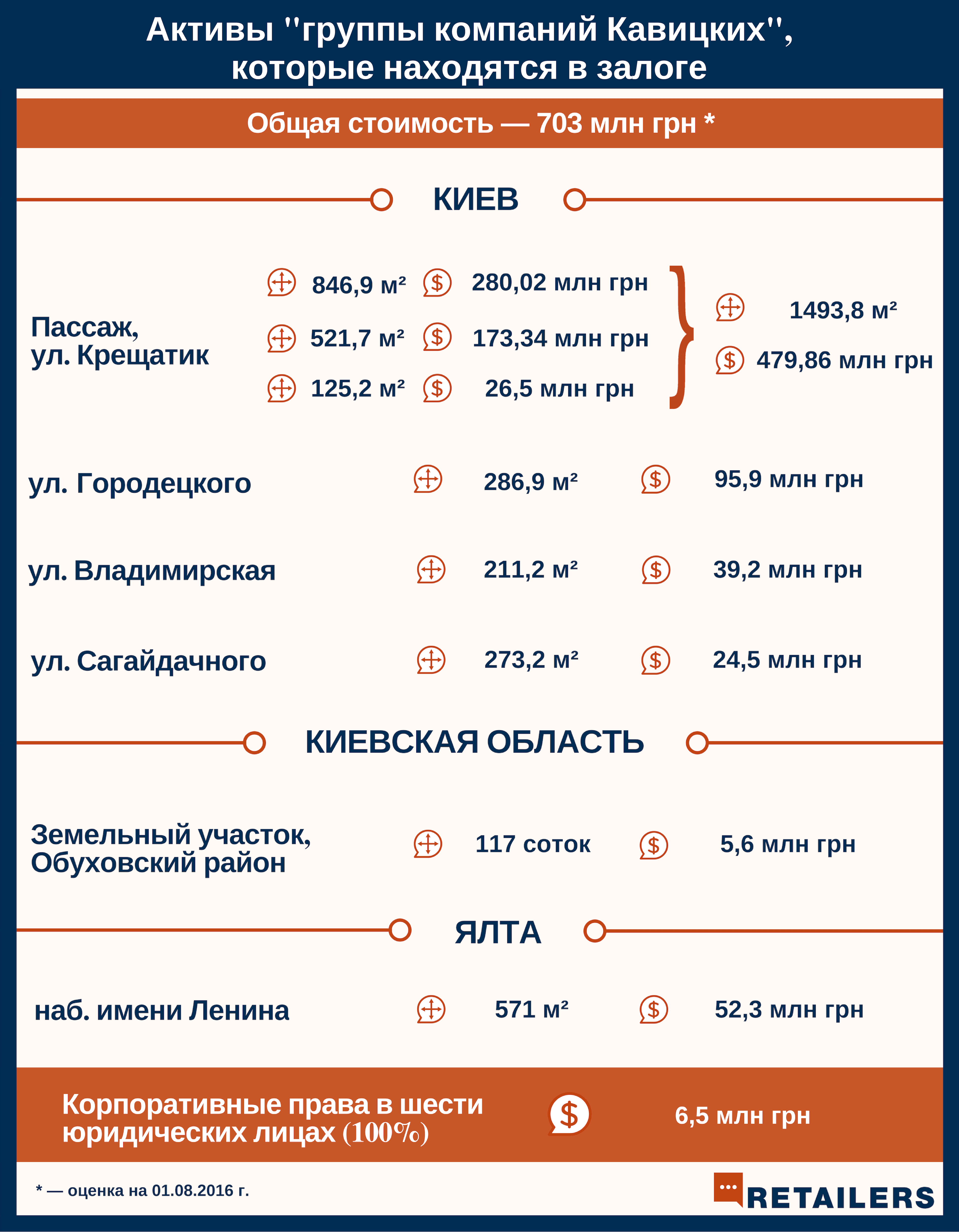 Самым дорогим активом (это 68% от общей стоимости) является недвижимость в Пассаже по ул. Крещатик площадью практически в 1 500 кв.м. Она оценивалась в 480 млн грн.