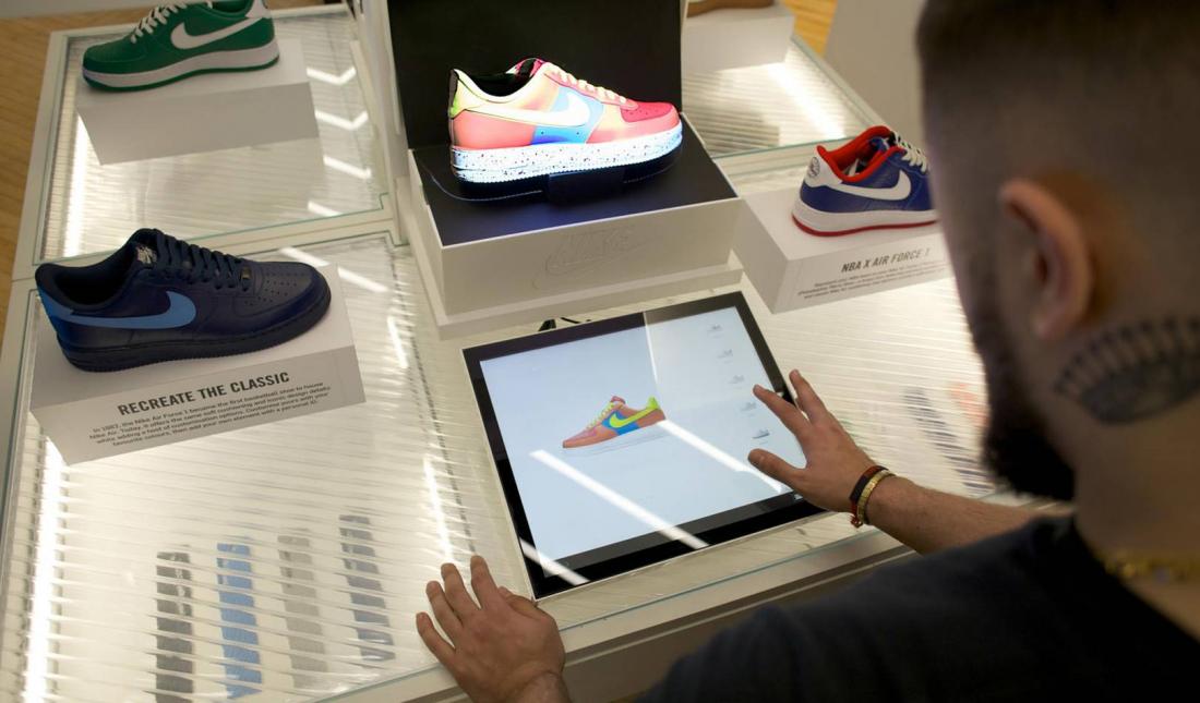 В одном из магазинов Nike покупатели могут самовыражаться, кастомизируя для себя спортивную обувь. Этот магазин имеет особенно умный дизайн. Столешница напоминает зону обслуживания фаст-фуд, а дисплей для обуви справа напоминает витрину продуктового магазина.