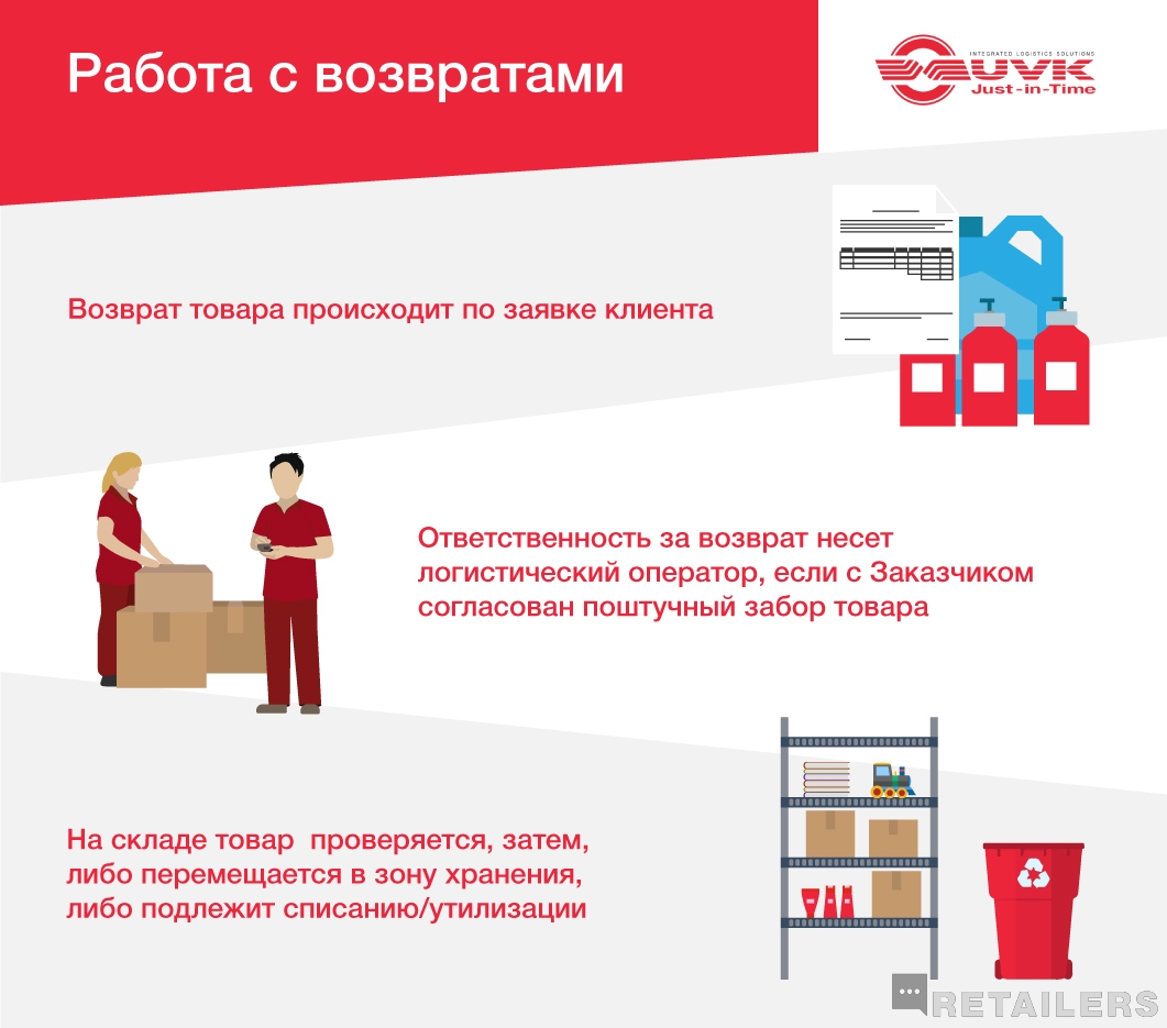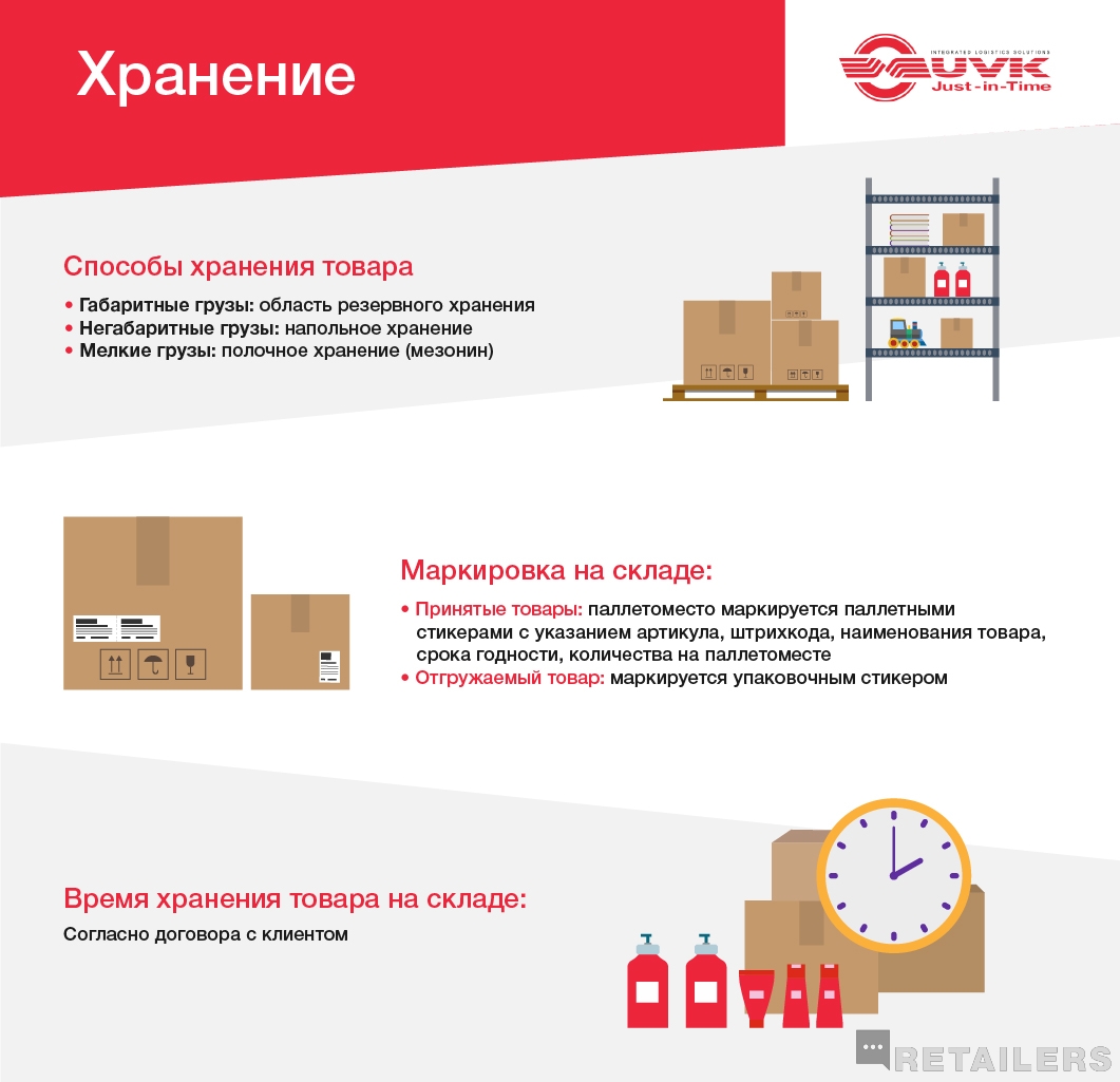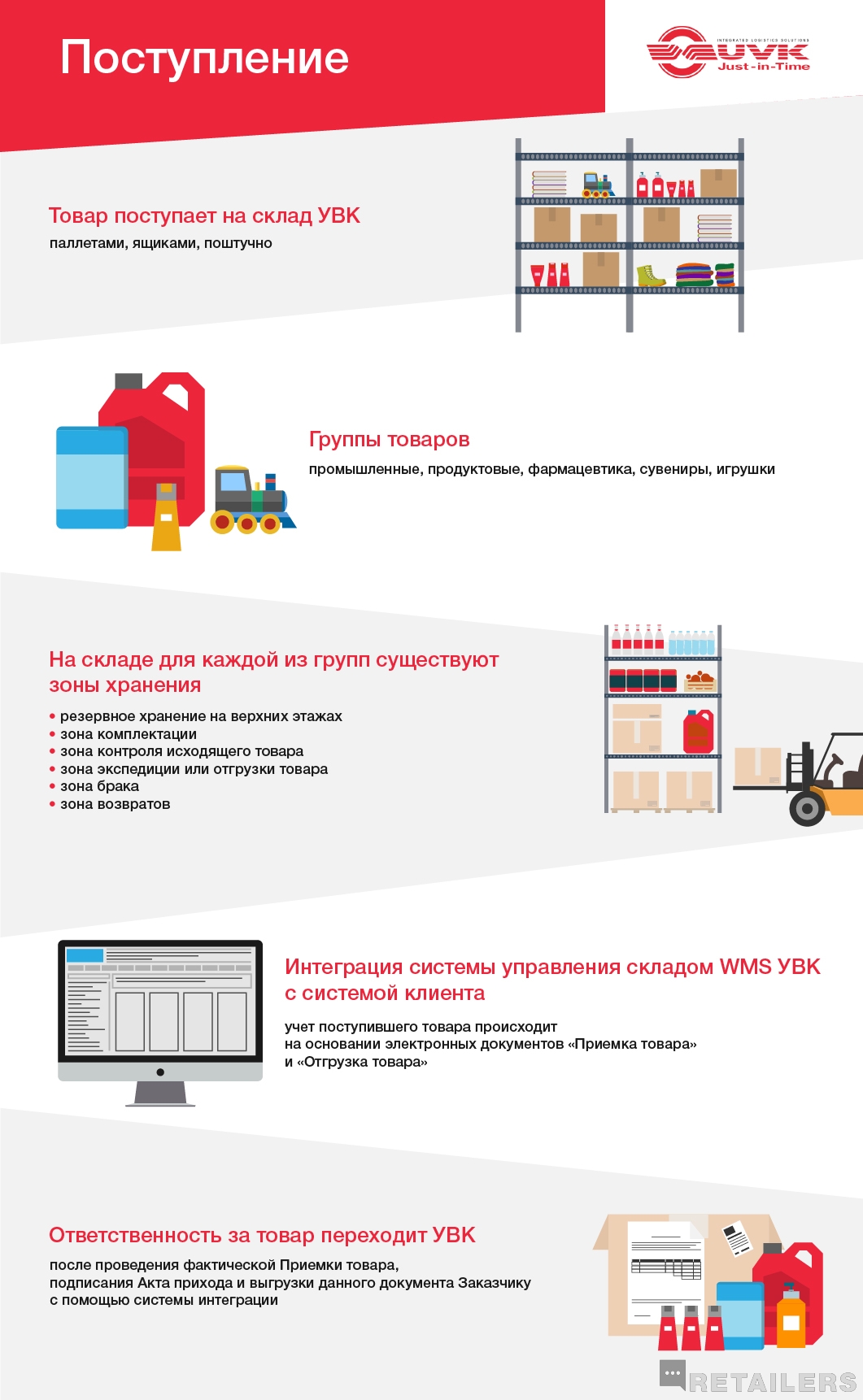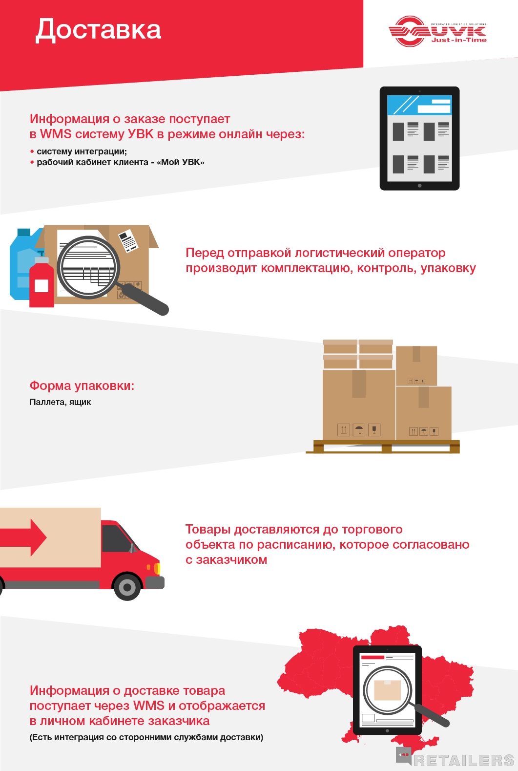 УВК Украина – ведущий национальный 3PL-провайдер с опытом работы более 17 лет. Компания предоставляет услуги по национальной и международной доставке, хранению и складским услугам, фулфилменту, таможенному оформлению, логистике для: FMCG, лекарственных средств, промышленных товаров, fashion-индустрии, торговых сетей. В инфографике показываем основные этапы движения товаров: от поступления до возврата