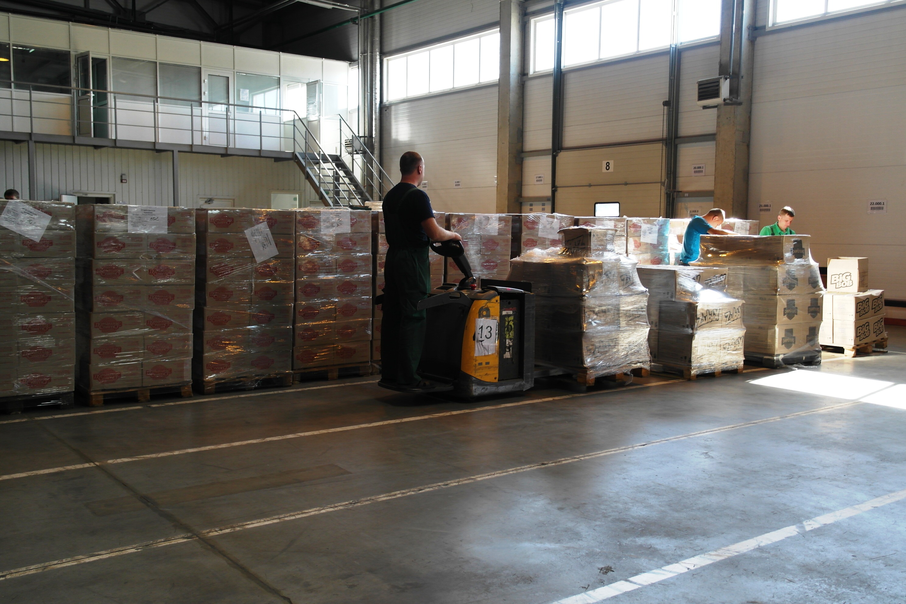 На складе 12 ворот, через которые осуществляется приемка и отгрузка товара. Товарные запасы проходят несколько этапов. Есть операторская, где находятся люди, которые ставят товар на приход. На этом складе один человек занимается приемкой документов, один — выдачей документов на отгрузку. Оригиналы документов (ТТН), по которым происходит прием поставки, передаются поставщику в конце приемки.