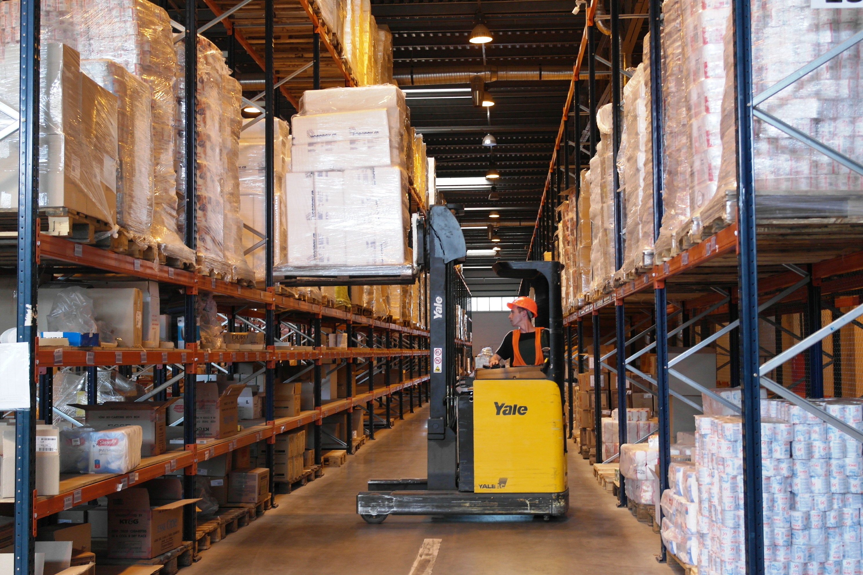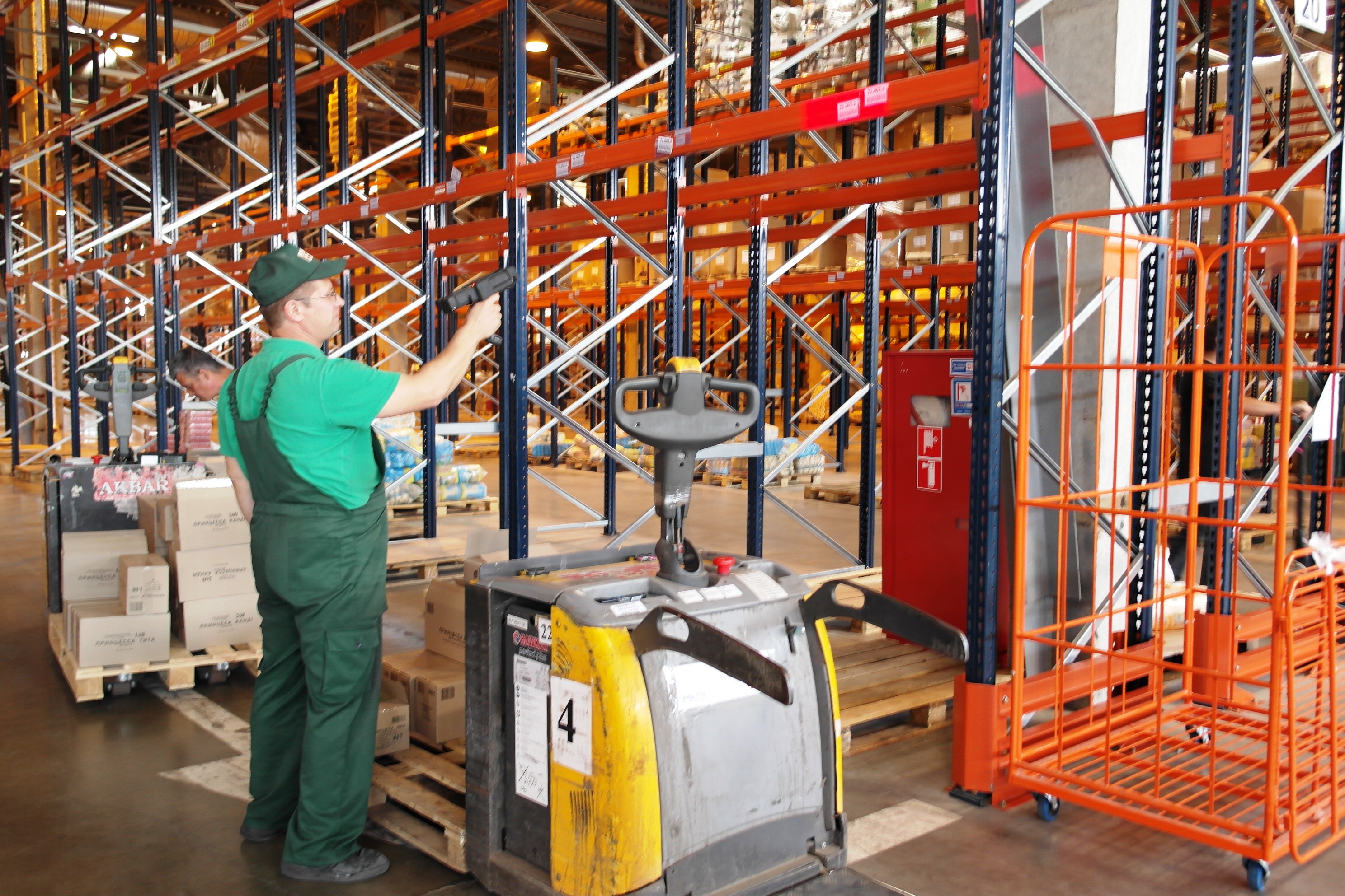 На складе идет монотонная работа, мимо нас проносятся reachtruck или, по-другому, штабелеры и электротележки.