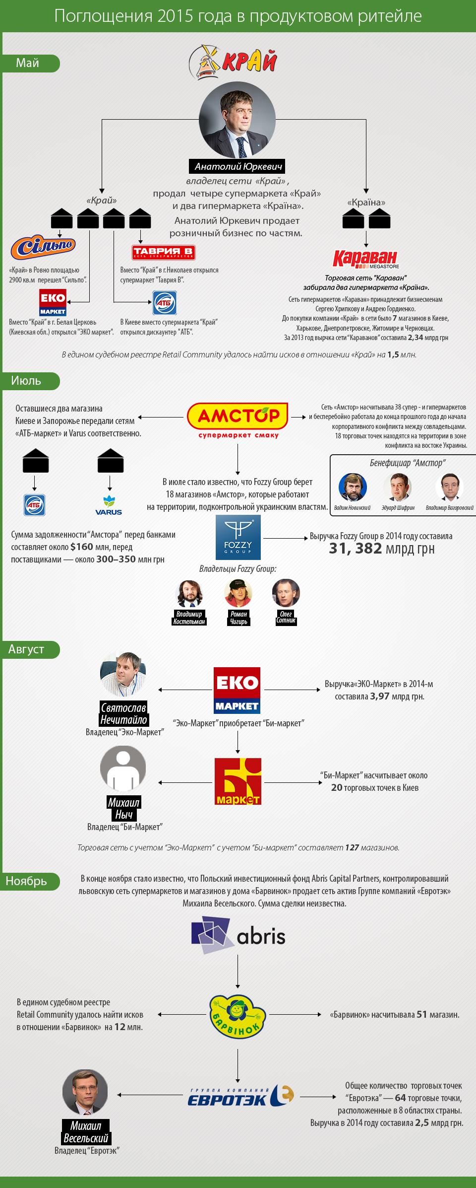 2015 год стал активным годом по сделкам между игроками продуктового ритейла Украины. Ушли с рынка сети «Амстор», «Би-Маркет», «Барвинок», «Край» и «Країна». Поглощаемые сети испытывали финансовые трудности, и все сделки в основном проходили без денег.
