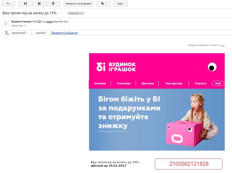 Ответа не нахожу, предполагаю, что это могут быть бонусы за подписку. Кликаю на «Получите скидку на игрушки», оставляю свой e-mail. Ничего не происходит, даже письмо об этом на почте меня не ждет.