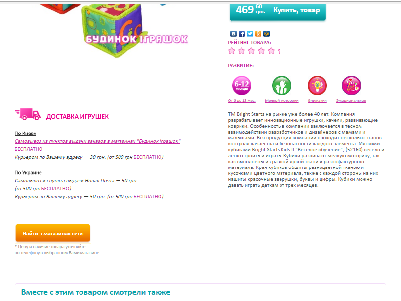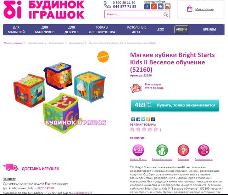 Мне нужно купить что-то из развивающих игрушек. Захожу в раздел, вижу фильтры по цене, бренду, возрасту. Выбираю возраст от 6 до 12 месяцев, нахожу мягкие кубики стоимостью 469,60 грн. Вижу пометку «Купить, товар заканчивается» и предупреждение: цену и наличие товара уточняйте по телефону в выбранном вами магазине. Немного странно, что цена товара в интернет-магазине и розничных магазинах отличается и ее нужно дополнительно уточнять по телефону.