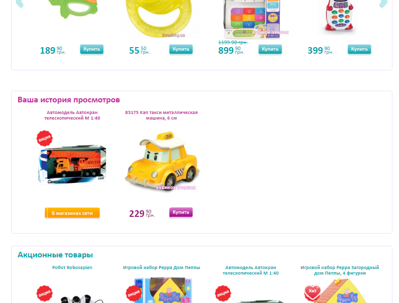 Интернет-магазин сохраняет историю моих просмотров, и я вижу, какие игрушки я смотрела до этого: блок вместе с рекомендациями и акциями находится ниже описательной части.