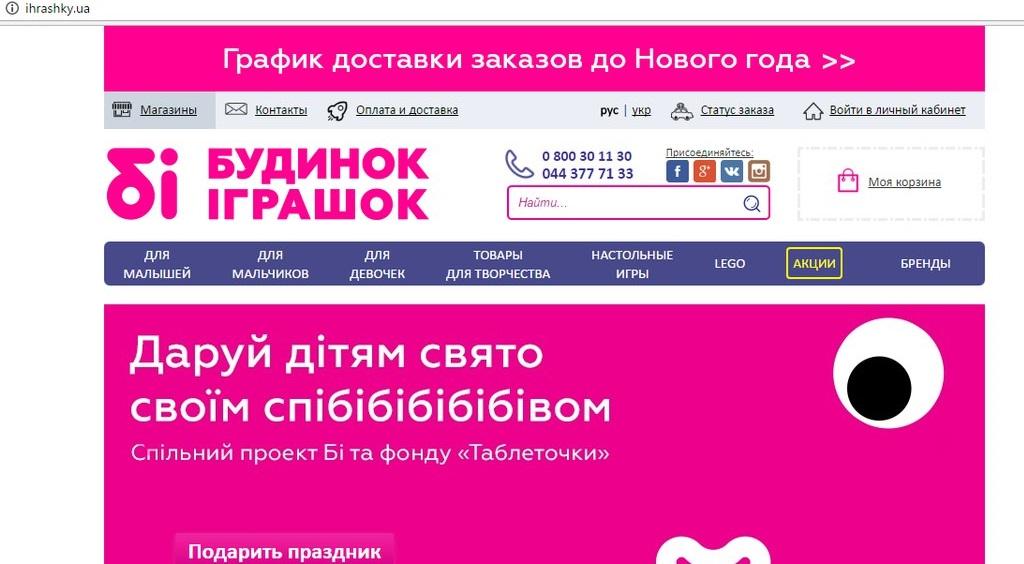 30 декабря 2016 года я решаю сделать заказ детской игрушки на подарок. Захожу на сайт ihrashky.ua, на главной странице вижу крупный виджет: реклама кампании «БІБІБІ» для «Таблеточки», рейтинг игрушек — интересная, ненавязчивая информация. «БІ» («Будинок іграшок») подумал о графике доставки к праздникам и разместил кликабельное сообщение о графике доставки в праздничные дни.