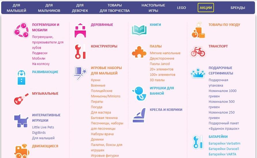 В ihrashky.ua удобное выпадающее меню с красивыми иконками и много фильтров.