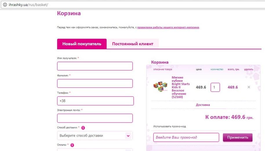 Я продолжаю оформлять заказ. Мягкие кубики Bright Starts Kids II «Веселое обучение» стоят 469,60 грн. Я замечаю волшебное слово промо-код и решаю посмотреть, что нужно сделать для того, чтобы им воспользоваться.