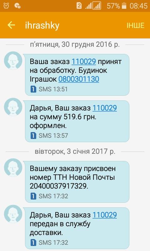 Таким образом, общий процесс покупки и возврата товара занял всего 7 дней с учетом того, что 3 из них попали на выходные и праздники. Я получила 4 письма по электронной почте (о заказе, об оплате (LiqPay), промо-код и оценку работы), сделала три телефонных звонка (заказ, уточнение условий доставки и уточнение адреса для возврата), получила 4 СМС от интернет-магазина (принят на обработку, оформлен, присвоен номер ТТН «Новой почты», передан в службу доставки и 1 от «Новой почты») и осуществила два пеших похода — в отделение почты и отделение интернет-магазина в «Будинке іграшок».