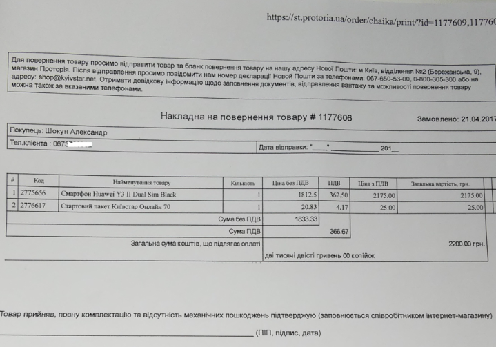 Я задаю вопрос по поводу возврата товара. Оператор сказал, что можно открыть, проверить целостность, но если я хочу вернуть телефон, то нельзя вставлять сим-карту и звонить по нему. Также он рассказал об условиях возврата. Я могу в течение 14 дней вернуть его в Киеве, в пункте самовывоза на ул. Шахтерская, 11. Но я живу в Чернигове. В таком случае компания пришлет на электронную почту заявление на возврат средств и сопроводительное письмо. Я должен буду отправить товар обратно «Новой Почтой». Денежные средства должны вернуться обратно на карту после заключения сервисного центра в течение трех банковских дней. Проверка сервисного центра, по словам оператора, должна занять максимум два дня.