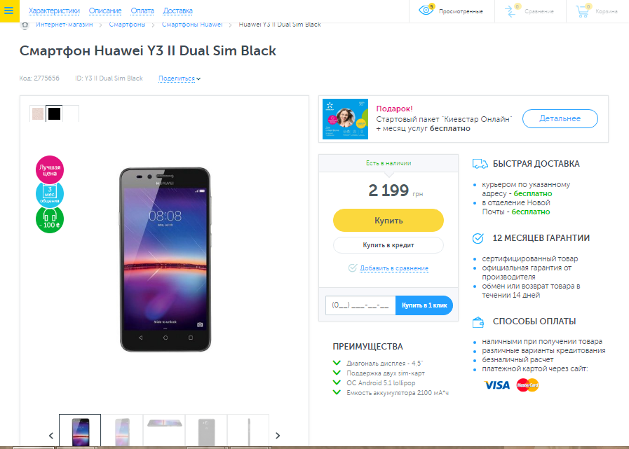 Читаю характеристики. По этой позиции есть возможность оплатить картой, заказать доставку курьером и вернуть товар. Мне еще нужно проверить работу кол-центра. Соединение с оператором заняло 20 секунд. Уточняю наличие — смартфон доступен. Спрашиваю о возможности оплатить картой на сайте — такая возможность есть. Курьер «Новой Почты» также доставит по указанному адресу бесплатно. Менеджер кол-центра порекомендовал внимательно осмотреть и проверить товар, прежде чем его забрать.