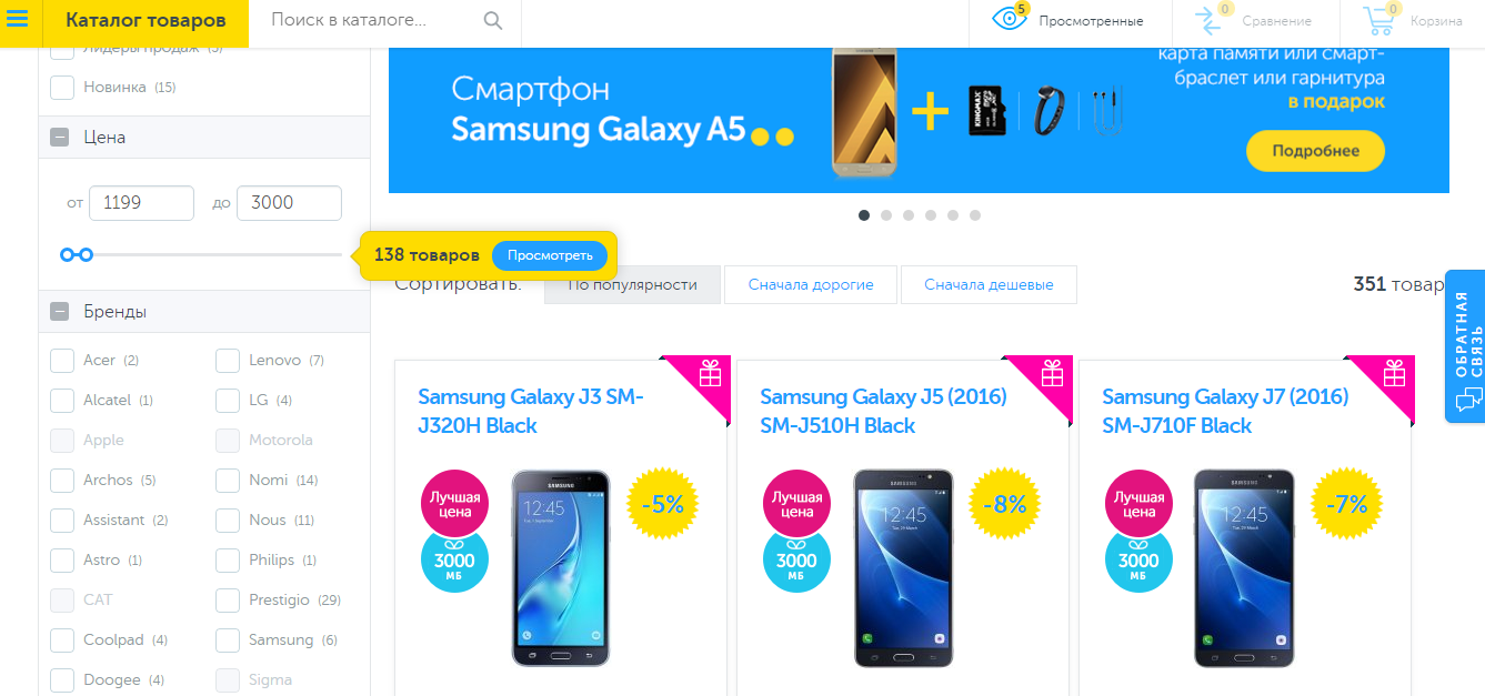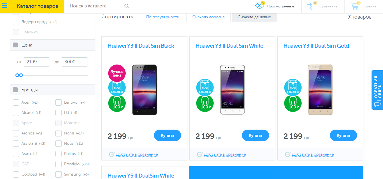 Перейдя на страничку выбора, я вижу, что смартфоны отсортированы по возрастанию цены и уже можно делать выбор.