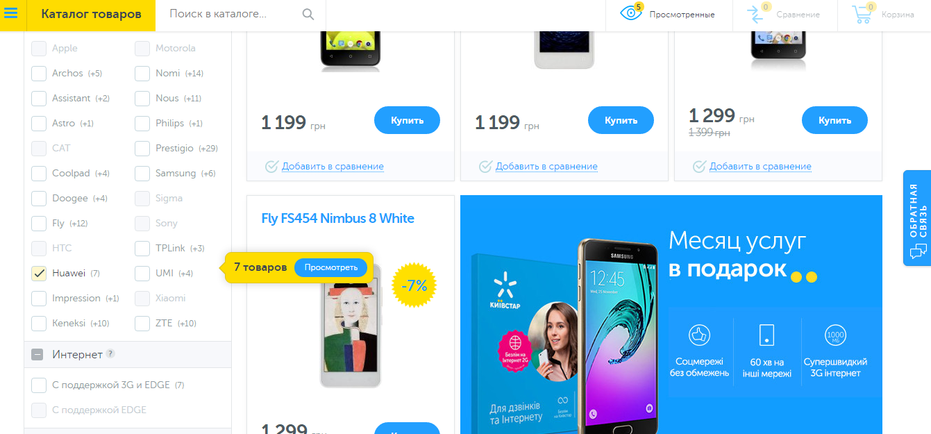 Выбираю фильтр «цена по возрастанию» и подыскиваю себе модель. У меня никогда не было смартфонов китайских брендов, поэтому решил остановить выбор на них. Из китайских брендов мне знакомы только два: Xiaomi и Huawei. Xiaomi не вписался в мой бюджет, поэтому я выбрал Huawei. В моей ценовой категории интернет-магазин предложил семь моделей.