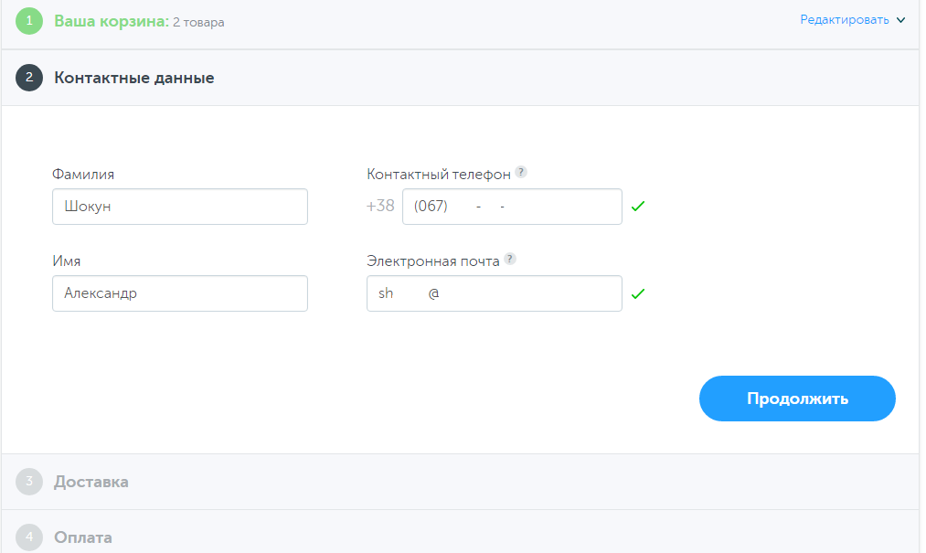 В разделе «контактные данные» четыре поля: имя, фамилия, телефон, e-mail — ничего лишнего.