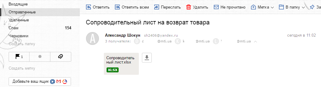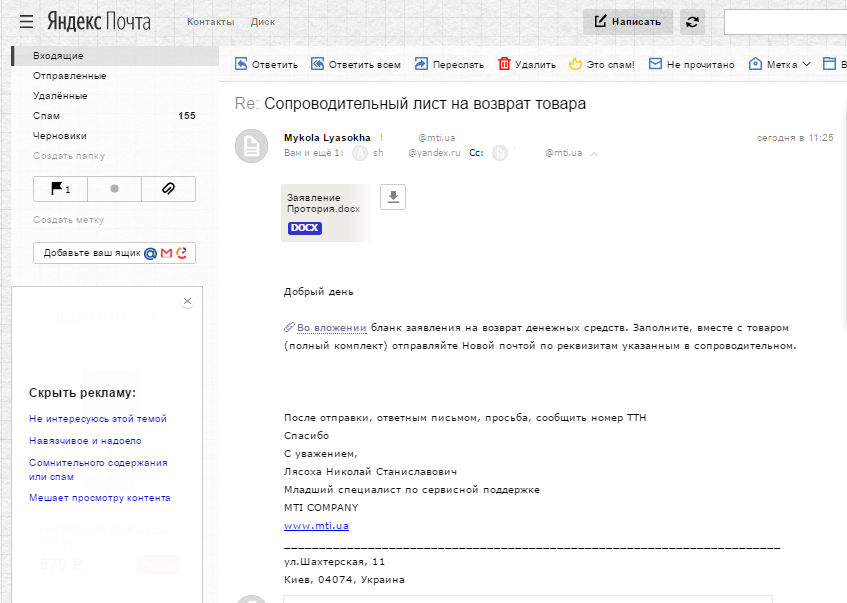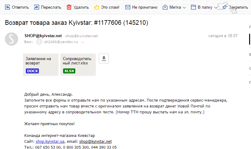 Два бланка — заявление на возврат и сопроводительное письмо — пришли на мой адрес электронной почты через 7 минут.