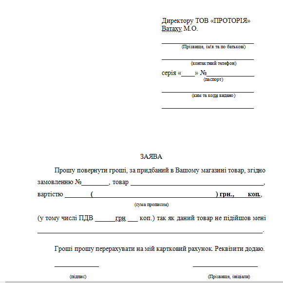 Накладная на возврат товара: