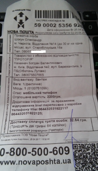 Буквально через несколько минут перезвонил менеджер интернет-магазина «Киевстар». Он сверил данные заказа и сообщил, что доставка будет уже завтра — 22 апреля. Он предложил выбрать интервал доставки: с 12 до 15; с 15 до 18 или с 18 до 21. Я выбрал интервал с 12 до 15, поскольку это суббота и не хотелось весь вечер ждать доставку. Менеджер сообщил, что у них проходит акция и я могу получить 1 Гб мобильного интернета на три месяца от компании «Киевстар» бесплатно. Также он напомнил, что при доставке нужно иметь подтверждающие документы. Общение заняло около 1,5 минут.