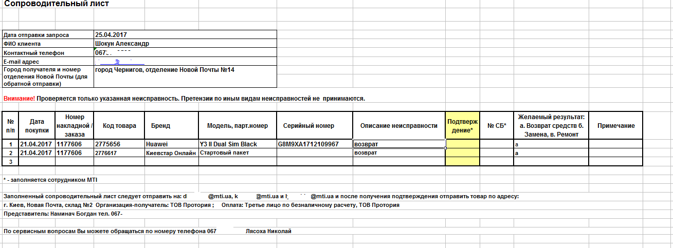 25 апреля, во вторник, в 11:02 отправляю сопроводительное письмо по указанным в нем адресам. Жду ответ от сервисного центра.