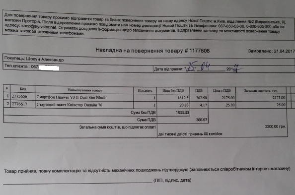 27 апреля, в четверг, в 10:40 позвонил оператор магазина «Киевстар». Но я был в это время занят и попросил его перезвонить через 30 минут. Интернет-магазин перезвонил в 11:16. Оператор сказал, что они получили обратно мой заказ и в течение дня со мной свяжется сервис-менеджер.