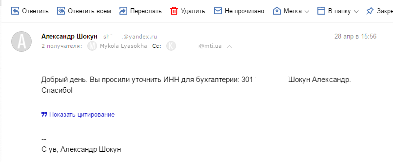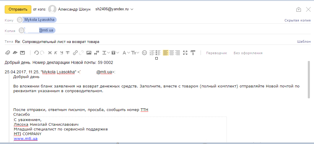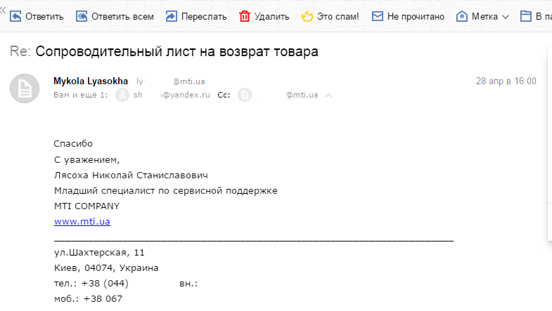 В тот же день в 12:09 перезвонил сервис-менеджер и сообщил, что претензий к товару нет и они мне смогут вернуть деньги в течение 3 банковских дней. Но я не указал номер ИНН, и мы договорились, что я отправлю свой номер электронной почтой. В этот день было много работы, и я только в пятницу, 28 апреля, вспомнил, что нужно отправить номер идентификационного кода, что и сделал в 15:56.