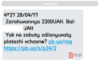 Во вторник, 2 мая, то есть меньше чем через три банковских дня, получаю СМС от «ПриватБанка», что средства зачислены.
