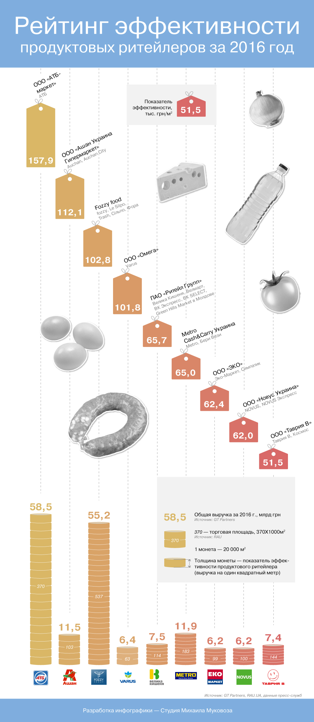 Для оценки эффективности работы розничных сетей в общемировой практике используют такие показатели, как выручка с квадратного метра торговой площади или выручка на сотрудника. Retailers определил, насколько эффективно работают крупнейшие национальные FMCG-ритейлеры. Наиболее эффективно торговую площадь использует сеть АТБ — годовая выручка с одного квадратного метра составляет 157 900 грн/кв. м. Вторую строчку рейтинга занимает Auchan с показателем 112 100 грн/кв. м. На третьем месте сеть Fozzy Group с цифрой в 102 800 грн/кв. м.